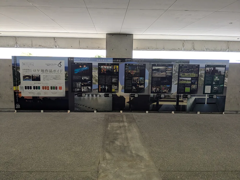 淡路夢舞台とその周辺で撮影された映像作品とともに、島内支援作品を約15mのパネルでご紹介します。