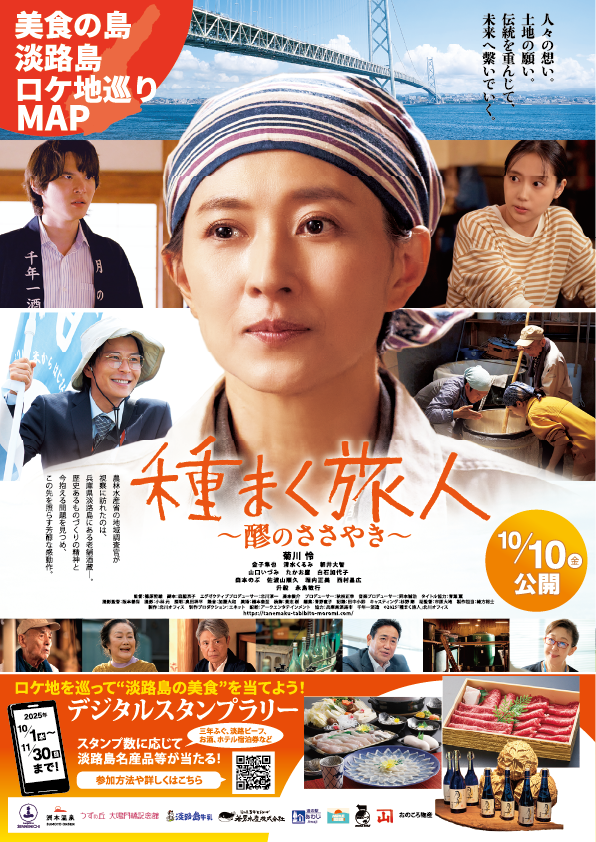 映画「種まく旅人~醪のささやき~」の公開にあわせ、ロケ地マップの配布及びデジタルスタンプラリー開催中!!島内に点在するスタンプを取得し、スタンプ数に応じて淡路島名産品等が当たります!